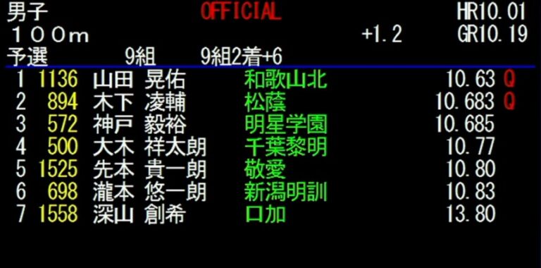 7月29日、福井9.98スタジアムで行われているインターハイ陸上競技に出場している木下選手の速報です。木下選手は、100m予選第9組に出場して2着。自己記録タイの成績で予選を通過し、この後、15:45から行われる準決勝へ進みました。