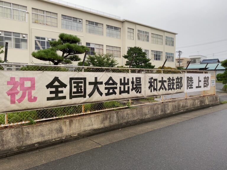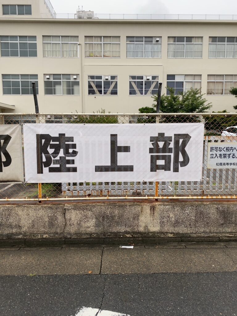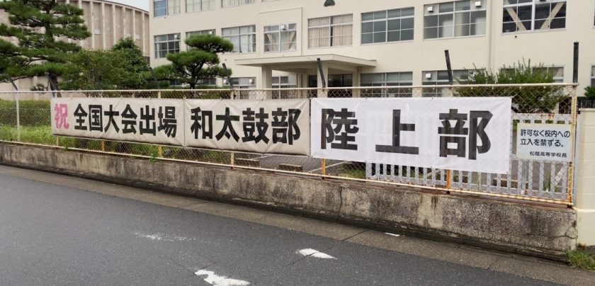 平成15年以来18年ぶりの全国高校総体出場を果たした陸上部に対して、松蔭高校同窓会「まつかげ会」より、横断幕をいただきました。現在は写真のように6年連続全国大会出場の和太鼓部の横に並んで張ってあります。まつかげ会の皆様、御支援いただき、ありがとうございました。