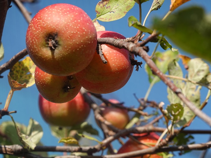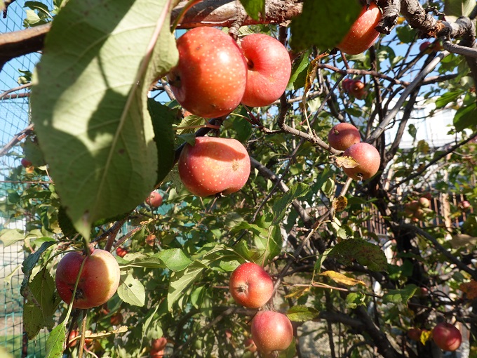 グラウンド東側のフェンス沿い植えられたリンゴの木が、今年は5センチほどの小さめの実を鈴なりにつけています。