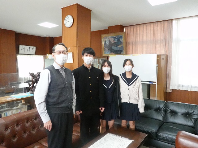 11月23日(祝・火)、和太鼓部が知立市文化会館で行われた高文連郷土芸能専門部の県大会に出場し、来年8月2日~4日に開催される、全国高等学校総文祭(2022東京大会)への切符を手に入れました。本日25日(木)の昼休みに、内田部長、加藤さん、石田さんの3名が、その報告に校長室を訪れてくれました。