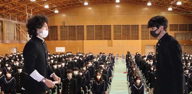 在校生代表の鈴木君から、オリジナルのクオカードの目録が贈呈されると、卒業生代表のマレロカバディジャ君が謝辞を述べ、在校生へのお礼とともに、「卒業生の全体写真入りのカードなので、使い切った後もみんな大切にしましょう」と卒業生に呼び掛けていました。(校長)