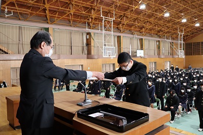 今年度の3か年皆勤生徒は40名。代表の浅井君に賞状を授与しました。年間をとおして様々な表彰をさせてもらいますが、私にとってこの皆勤賞は最も価値ある表彰だと思っています。入学以来、誰にでもチャンスはありますが、実際に成し遂げるには非常に難しいからです。もちろん受賞された皆さん一人一人の努力の結果ではありますが、健康管理など日々見守ってくれたご家族への感謝の気持ちをどうか忘れないでください。