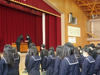 令和4年2月28日(月)、明日の卒業式を控えて、皆勤賞授与式、同窓会入会式、在校生から卒業生への記念品贈呈式を行いました。