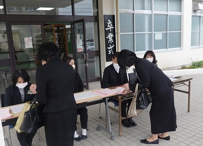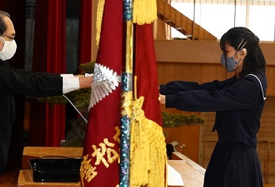 「第74回生、349名の皆さん卒業おめでとう。これまで皆さんを慈しみ育んでこられたご家族の愛情、また、時には優しく時には厳しく教え導いてくださった先生方、そして陰に日向に、いつも温かく見守っていただいた地域や同窓会の方々への感謝の気持ちを忘れることなく、本校を卒業したことに自信と誇りを持って、さらに大きく成長してもらいたいと思います」