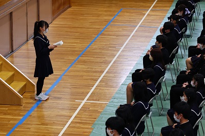 「部活動や生徒会行事…何があっても臨機応変に対応される先輩方の柔軟さと的確な指示。その大変さを感じさせない生き生きとした笑顔。すべてが私の憧れでした。先輩方が築き上げてきた伝統を責任をもって受け継ぎ、新たな松蔭高校の歴史の1ページを創り上げていけるよう尽力することを誓います」(在校生代表 岩田彩花)
