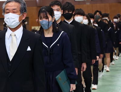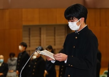 「…思い返せば私たちの高校生活は、数えきれない楽しさだけでなく、大きな困難と共にありました…しかし、コロナのもたらしたものは不安や不自由さだけではありません。困難や辛さに打ち勝っていく強さと、当たり前だと思っていたことを違う視点でとらえ、新たなものを創り出していく発想力を私たちは得ることができました。松蔭で培ったこの力が、今後直面するであろう幾つもの困難を乗り越えていく原動力になることを確信しています… 最後に、私たちを温かく見守り、愛情を注いでくれた家族にこの場をお借りして感謝したいと思います。18年間、本当にありがとうございました」(卒業生代表 升谷明人)