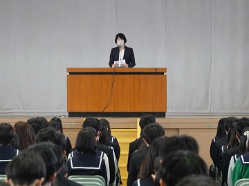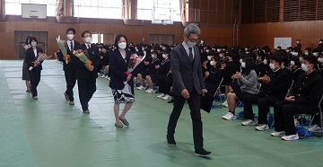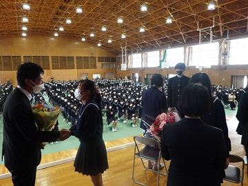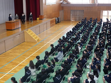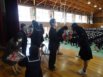 4月5日(火)春の暖かな日差しのもと本校体育館にて離任式を行い、これまで本校の教育活動にご尽力いただいた先生方を在校生(新2・3年生)全員と職員一同で見送りました。