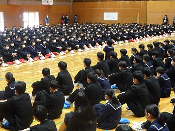 4月7日(木)、3学年揃って、いよいよ令和4年度の学校生活がスタートしました。始業式は、1・2年生は体育館に集まり、3年生は教室で同時放送を聞く形で行いました。その後、引き続いて体育館では、新入生との対面式を行いました。
