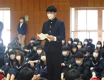 はじめに、生徒会長の小代さんから歓迎のあいさつがあり、新1生代表の八木君の「勉強や部活動、新しい環境への不安もありますが、この松蔭高校で過ごす日々を、中学校とはまた違った新たな経験を通して実りあるものにしていきたい。」という言葉どおり、新入生たちの高校生活への期待や希望、そして、ちょっぴりの不安なども伝わってくる交流の機会となりました。