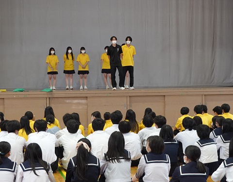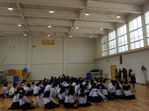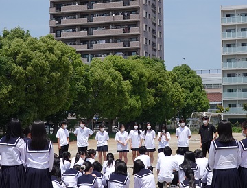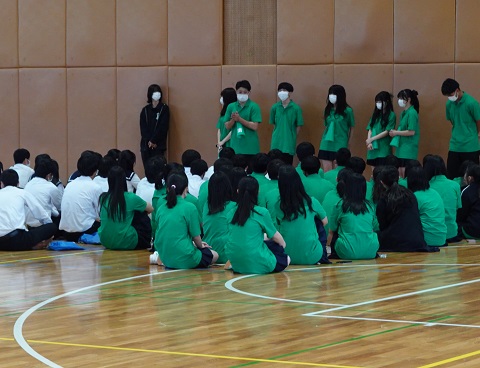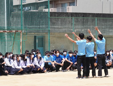 5月18日(水)久々に青空が広がる中、来月の体育祭に向けて「群団集会」が行われました。4月以降、パートごとにテーマや衣装、パネルやマスコットなどについて構想を練って準備を進めてきましたが、中間考査が終了したこの日、いよいよ学年縦割りで構成された9つの群団が、グラウンドや体育館、武道場などにそれぞれ分かれて集まりました。