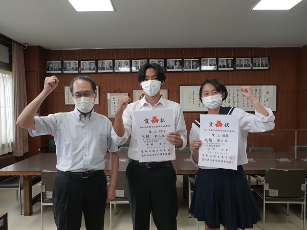 先週末に行われた新人大会(愛知県大会)において、男子円盤投と女子5000mW(競歩)の種目で、それぞれ2年生の伊藤選手と山口選手が6位に入賞しました。これにより、来月10月29日(土)~30日(日)岐阜メモリアルセンター長良川競技場で開催される、第25回東海高等学校新人陸上競技選手権大会に出場が決まりました。写真は、今日早速、校長室に報告に来てくれた時のものです。10月になってから、改めて壮行会で記録更新への意気込みなどを二人から聞くことができると思います。今後、修学旅行や定期考査も控えている中、コンディションの調整などに気を使うこととは思いますが、東海大会でのさらなる飛躍を祈っています。(校長)