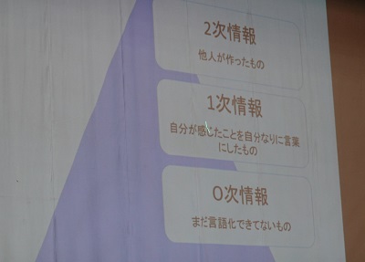 まずは、何となく感じたことや気になっている”もやもや”(0次情報)を自分なりに言葉(1次情報)にしてみることから始めて、それをネットや本(2次情報)で調べて検証してみる。実験・実習・調査もこの段階。その過程で、グループで互いに比較したり、誰か専門家や大学生から意見をもらっても良いでしょう。私も生徒の皆さんが気軽に意見交換ができるように、大学の先生や大学生の先輩などと学校との間で人的ネットワークを充実させていくことが必要だと思いました。