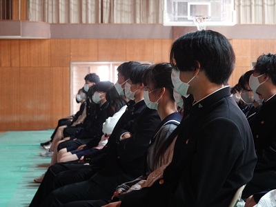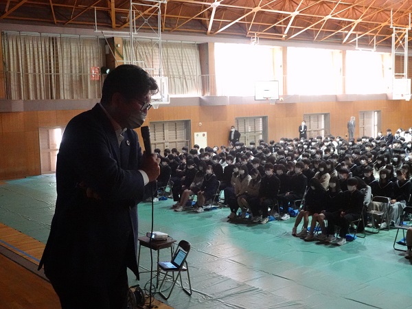 横田先生のお話(授業)は、高校時代の恩師との書簡のやり取りや大学のゼミの学生たちの夢や仕事のお話から始まり、人生100年時代のキャリアの考え方について生徒たちにいくつもの実例をあげて問いかけていきました。今の時代の安定とは自分の実力をつけること、自分の生き方を自分で決断することが大切。夢や転職が2~3回あって当たり前、でもそのためには、まさに今、努力してみることが必要なのだと強調されていました。