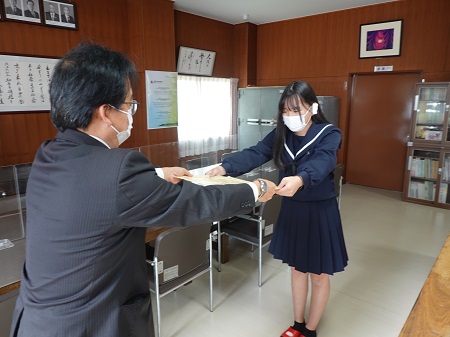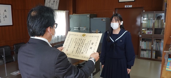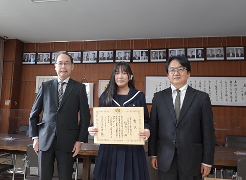 11月21日(月)昼放課、「税に関する高校生の作文」において、1年生の佐々木唯花さんの応募作品『税金に支えられた私たちの生活』が優秀と認められたのを受け、名古屋市中村税務署の署長 竹内一路 様がご来校され、校長室にて本人に表彰状が授与されました。