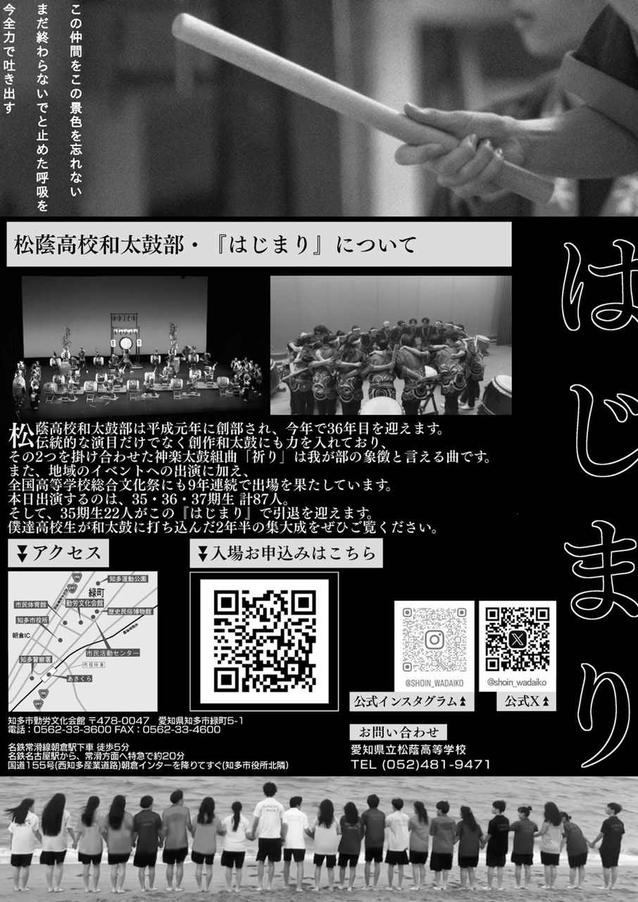 8月10日(土)、11日(日)に、知多市勤労文化会館にて松蔭和太鼓部の自主公演を行います。35期の引退公演でもあります。
