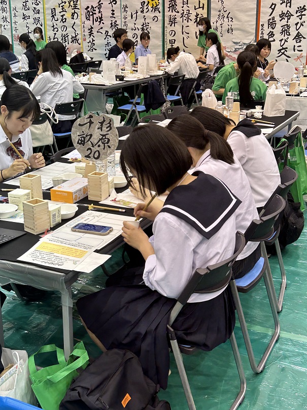 自分の作品の前で制作意図や感想を伝えあったり、岐阜の檜を使った筆筒と美濃和紙を使った栞に揮毫したりして交流しました。
