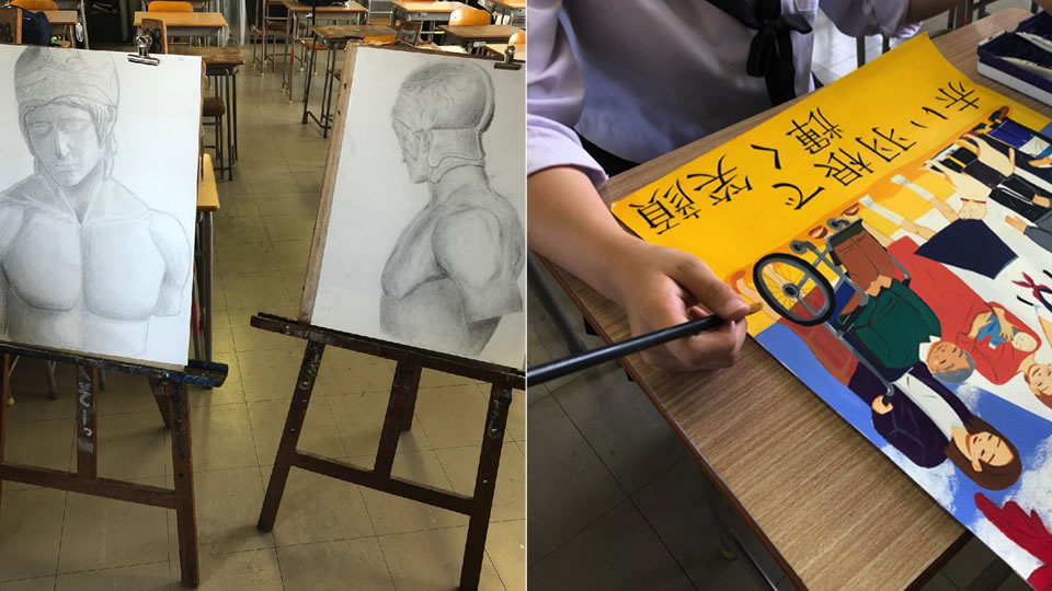 火曜日~金曜日の週4日、美術室で活動しています。イラストやポスターを描いたり、粘土を使った作品なども作っています。作品は文化祭で飾ったり、コンクールに出したりしています。